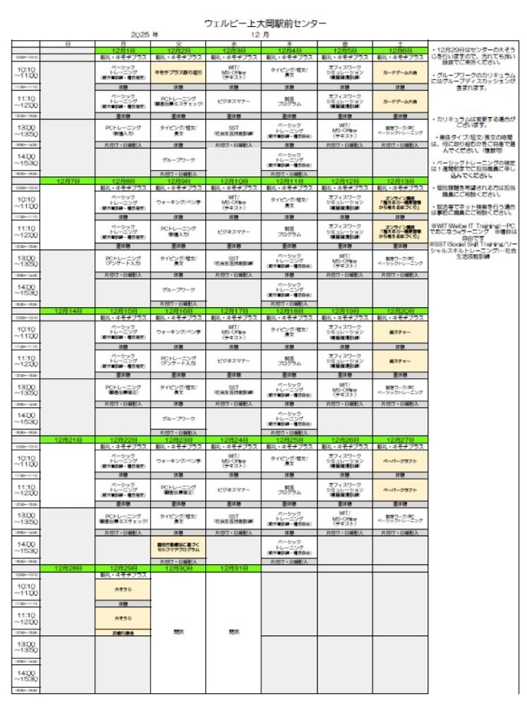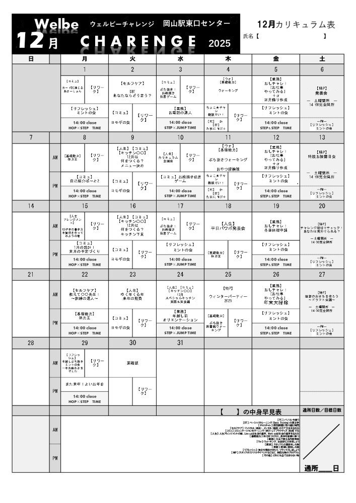 【チャレンジ岡山駅東口】12月のカリキュラムカレンダー