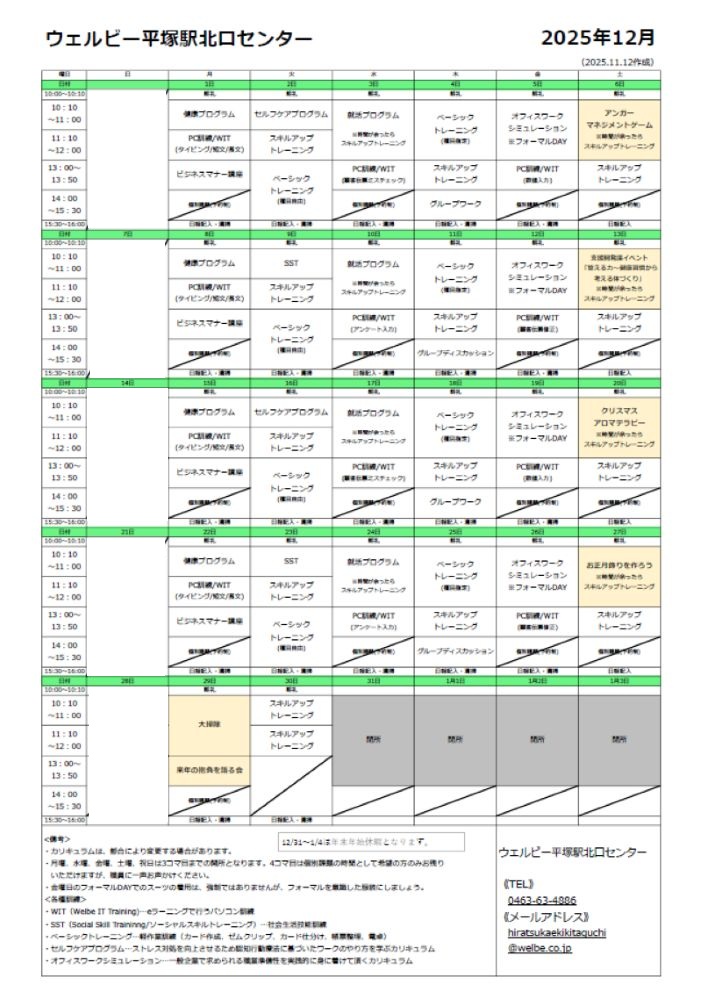 【平塚駅北口】12月プログラム表のご案内