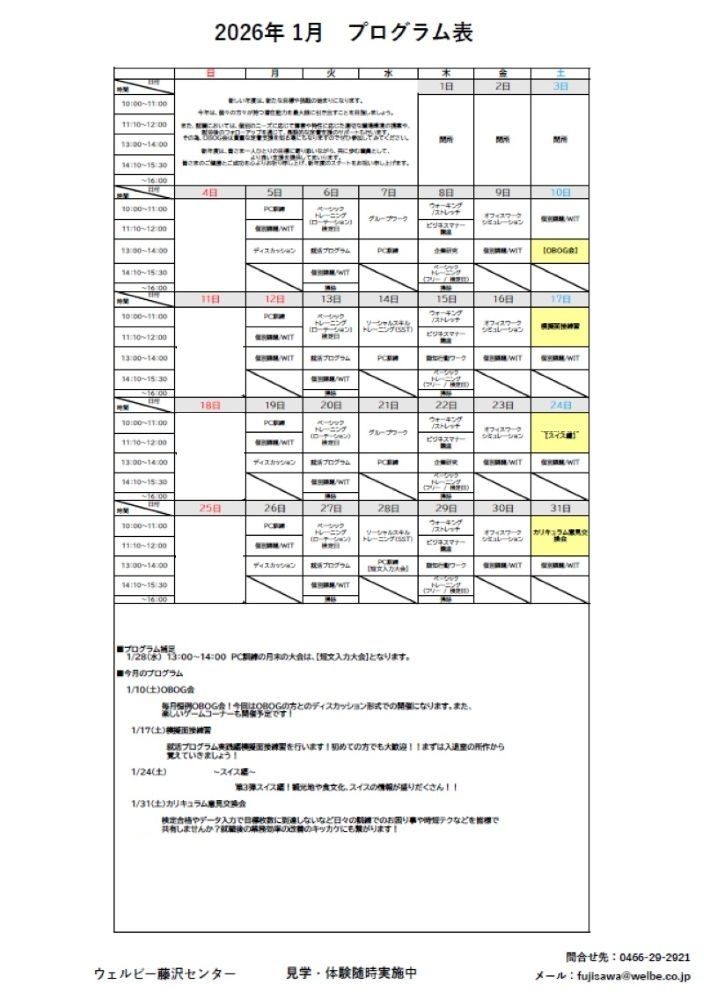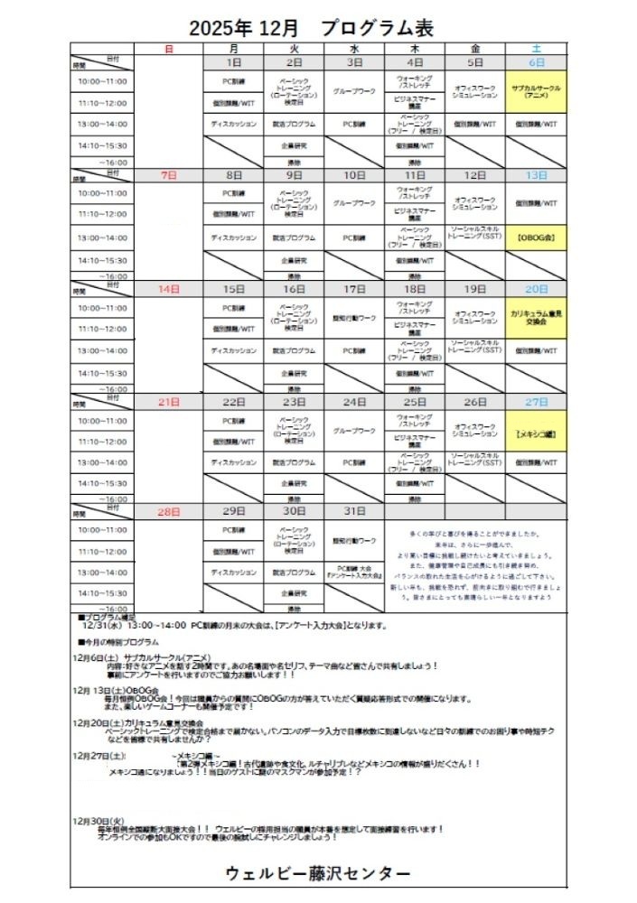 【藤沢】12月&1月プログラム表のご案内