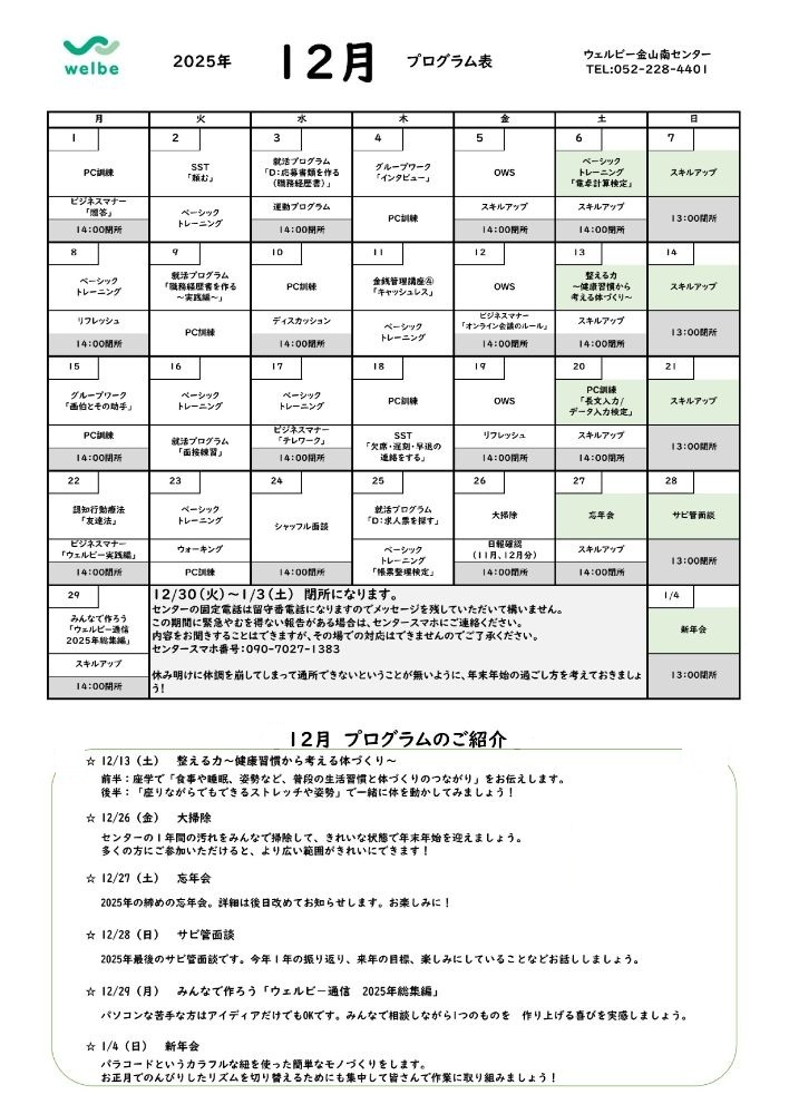 『12月プログラム表』についてです!