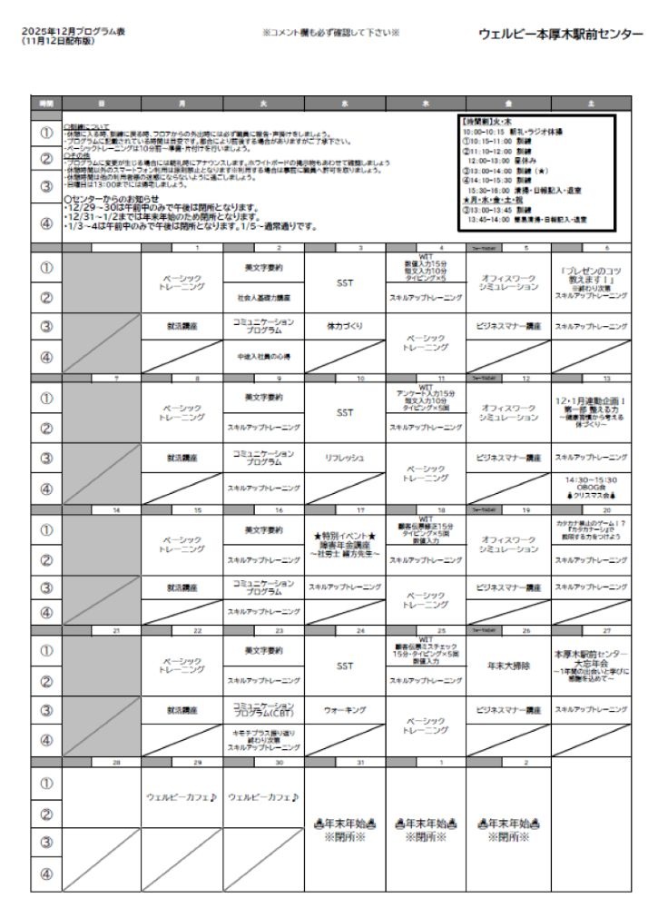 【本厚木駅前】12月プログラム表のご案内