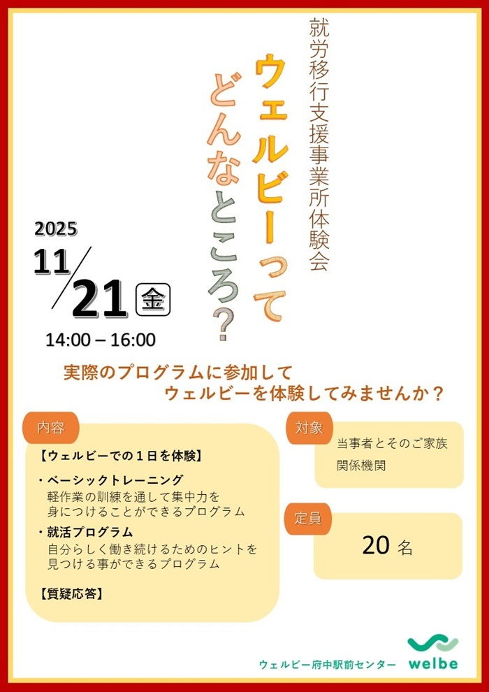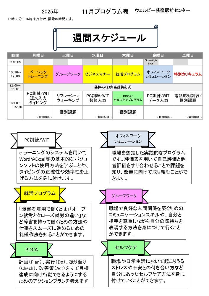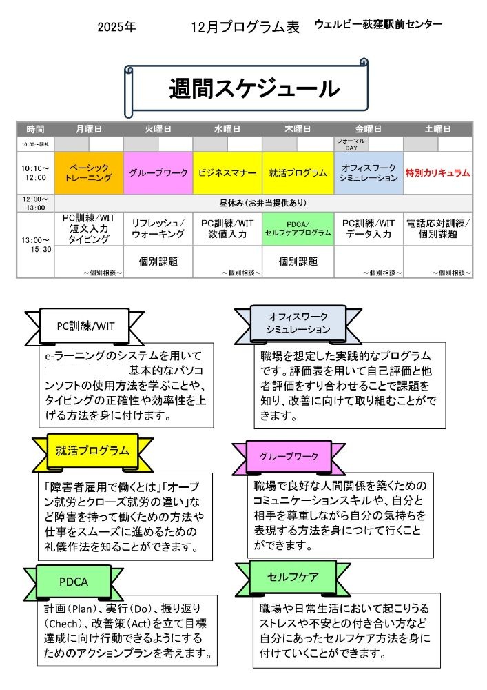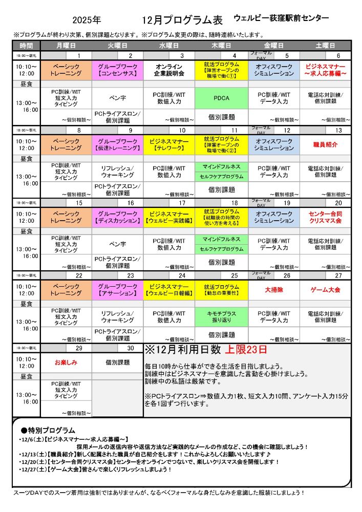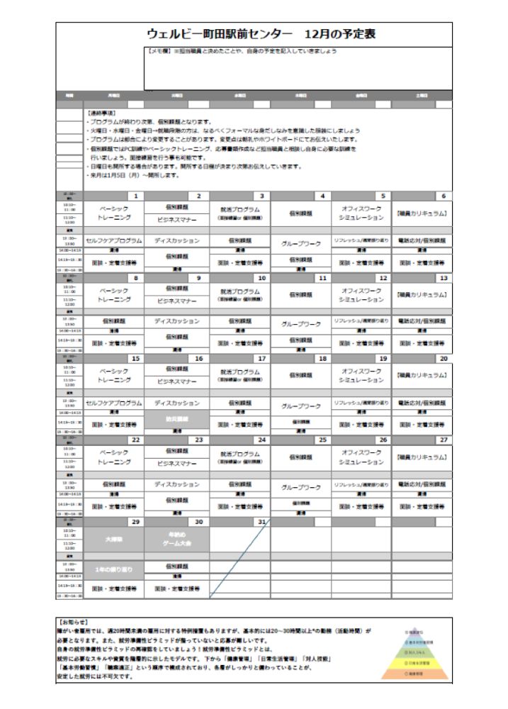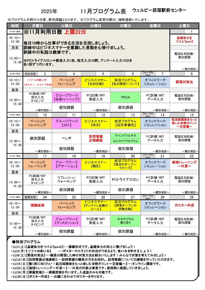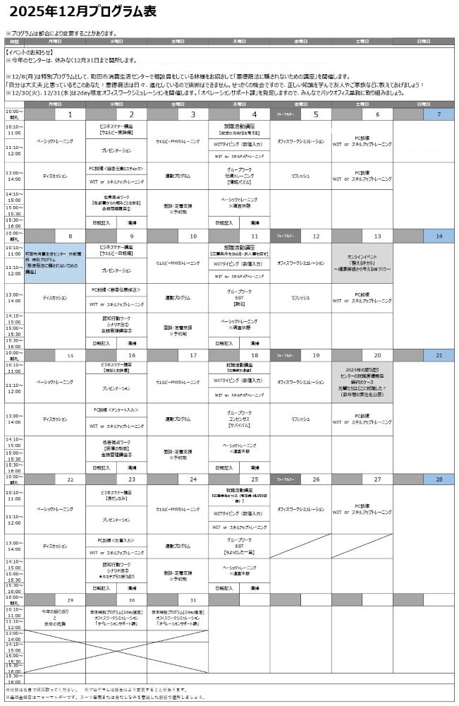 以上のように、ウェルビー渋谷センターでは上記のようなプログラムをはじめ日々の訓練以外にも、土曜日と祝日は「特別プログラム」として月ごとに様々なプログラムを開催しています。