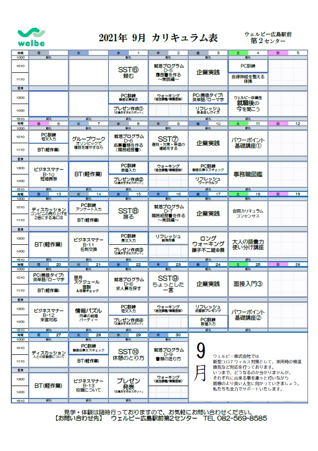 早速ですが9月のカリキュラムをご紹介したいと思います。