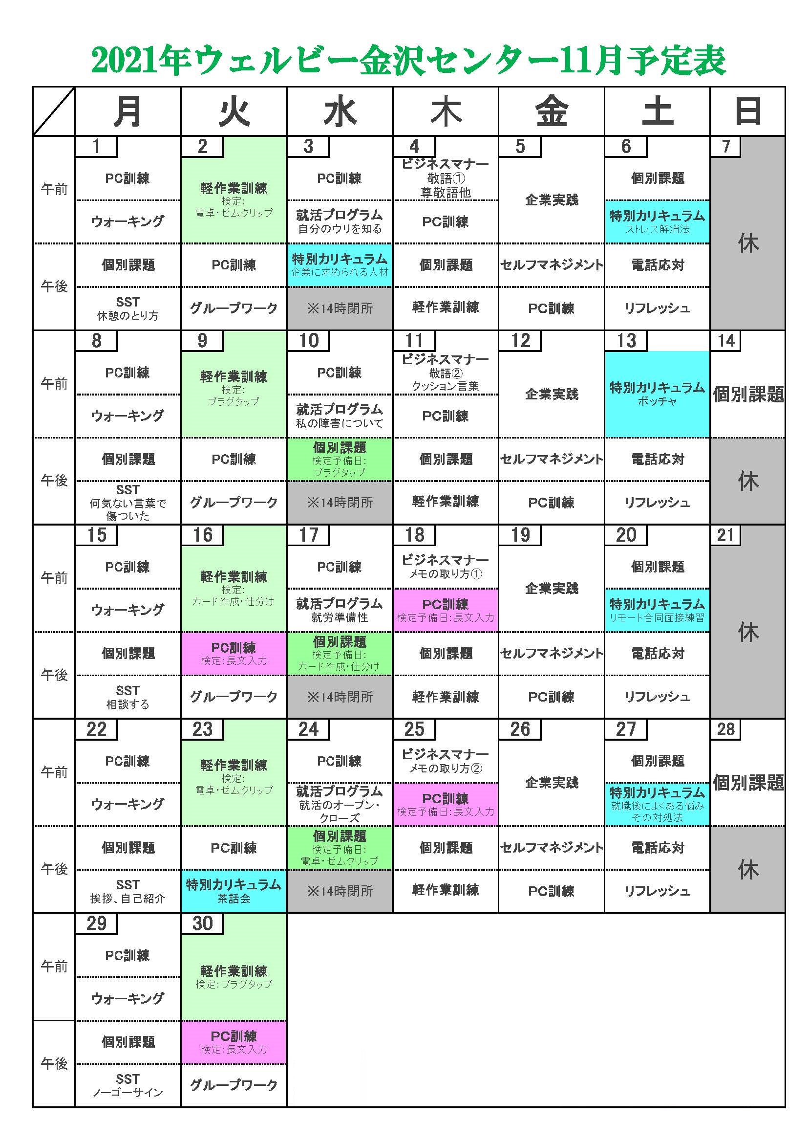 さて、ウェルビー金沢センターの11月予定表をご案内致します☆