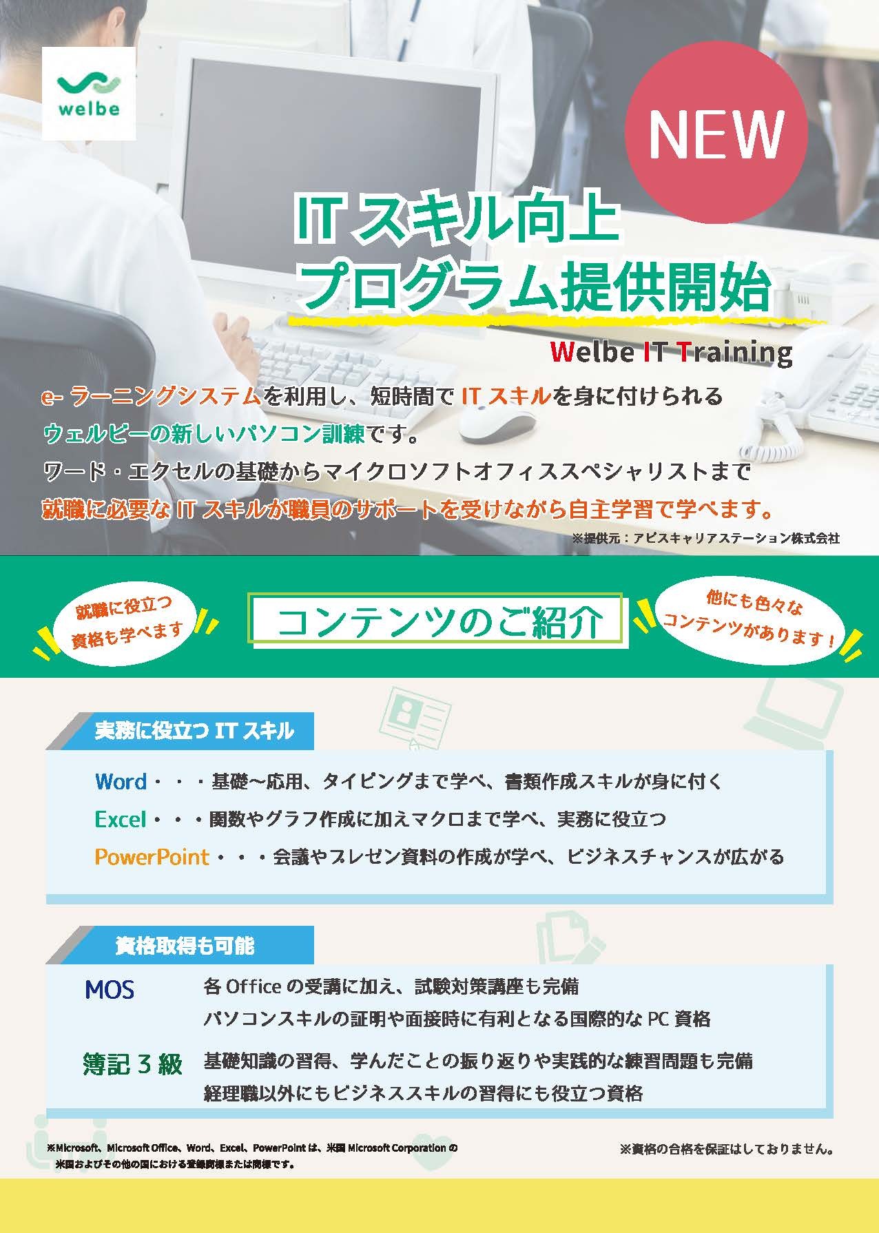 従来のテキストを使用したPC訓練に加え、ITトレーニングを導入してWordやExcel、PowerPoint、資格試験のサポートなど、利用者様のペースや課題に合わせたPC訓練を実施しております。ぜひ実際のトレーニングを体験してください