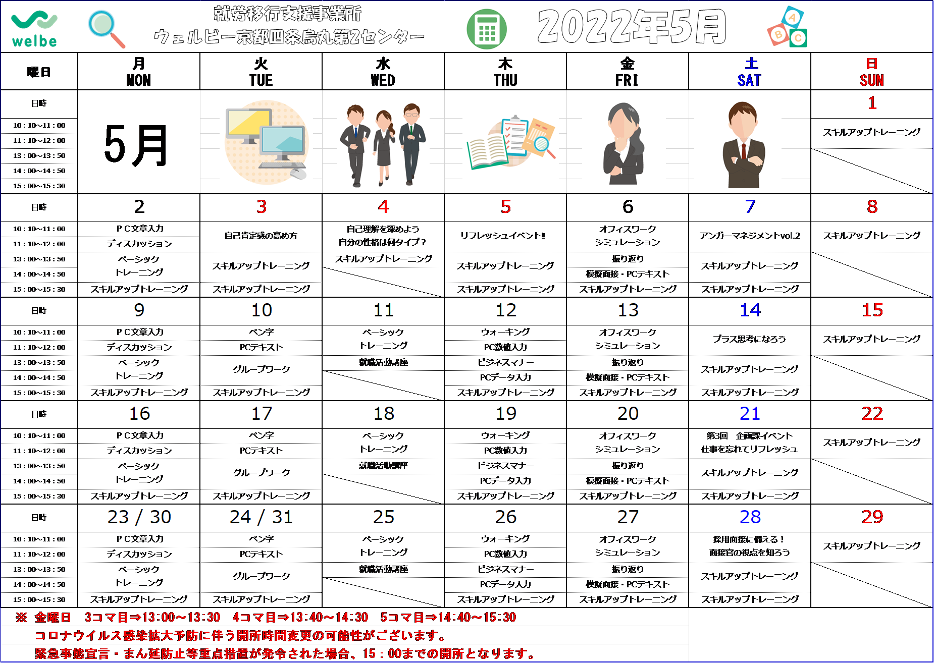 汗ばむ陽気の日も多くなりましたね。ウェルビー京都四条烏丸第2センターでは皆さん、就職に向けて毎日の訓練に励んでおられます。