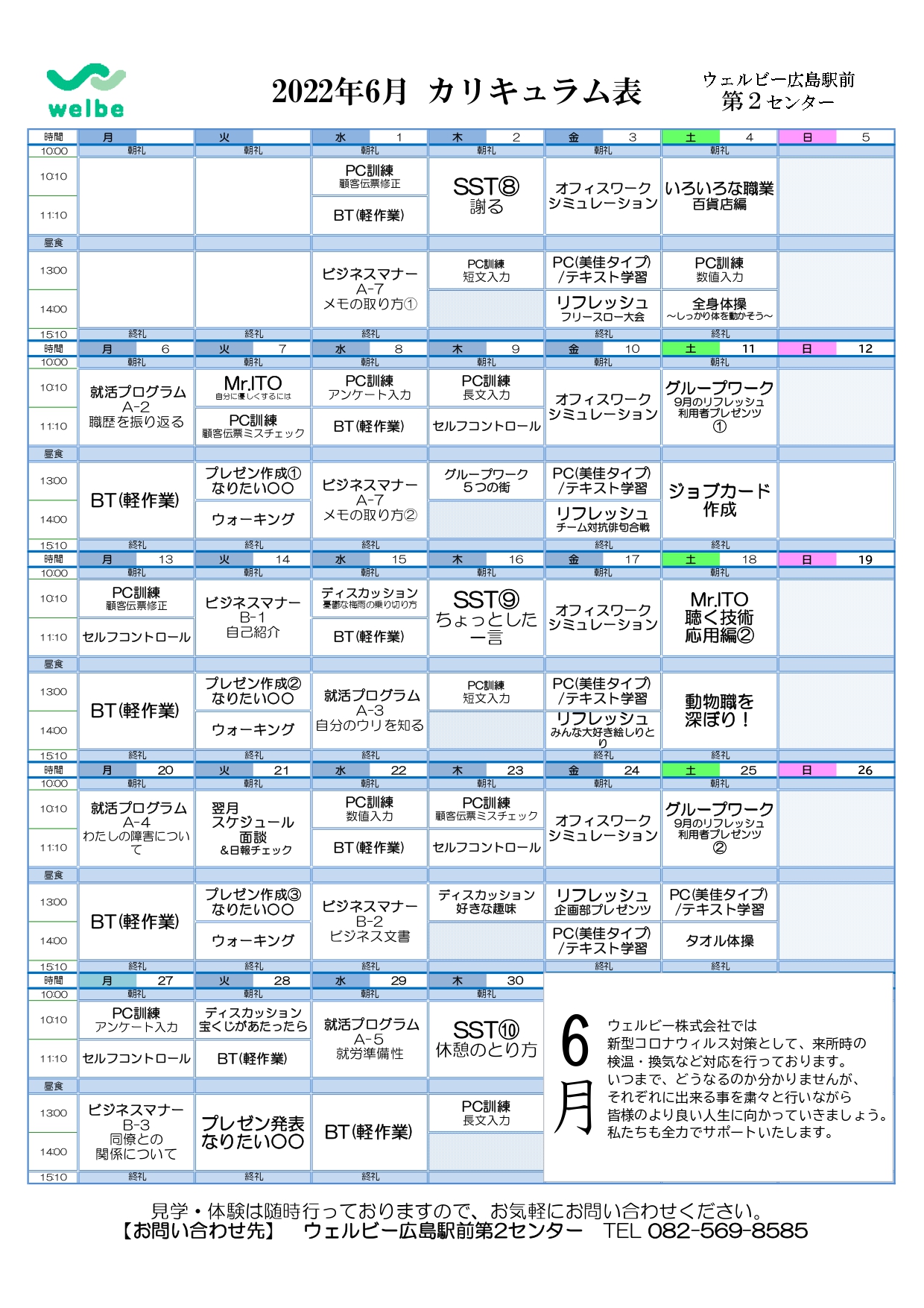 では、ウェルビー広島駅前第2センターの6月カリキュラムをご紹介します。