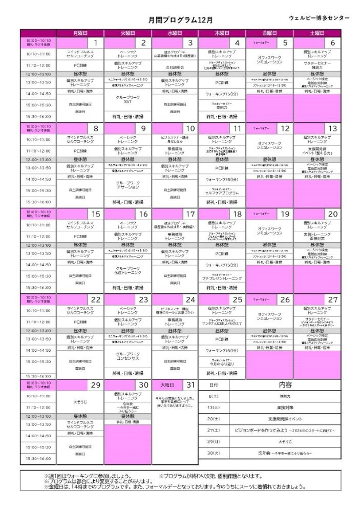 12月のイベントスケジュールが完成しましたので、ご案内いたします。