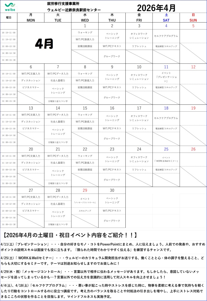 ウェルビー近鉄奈良駅前センタースケジュール2026年4月