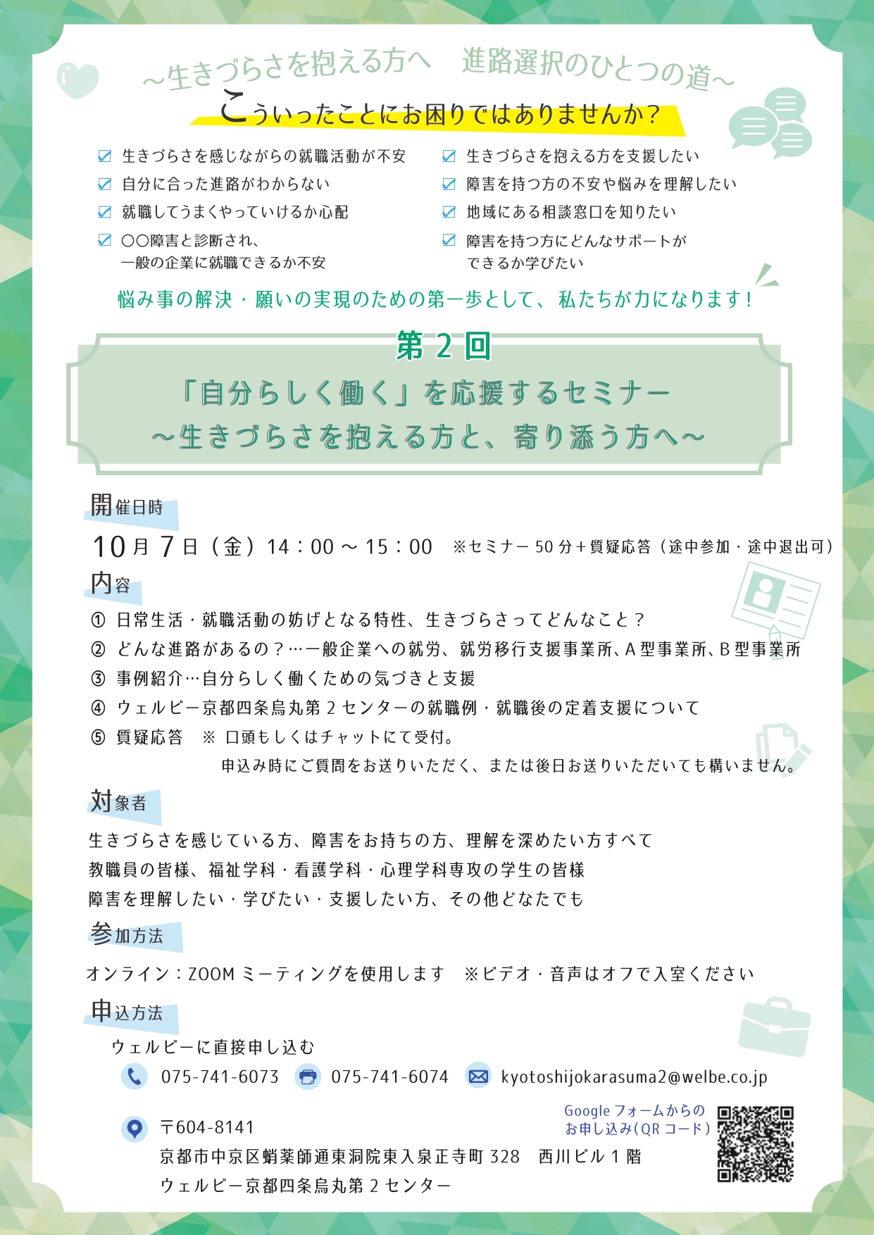 今回は、困りごとを抱えながら就職活動をしている方、生きづらさを感じている方、そういった方々を支援したいと思っている方向けのセミナーとなっております。