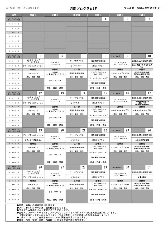 1月のイベントスケジュールが完成しましたので、ご案内いたします。