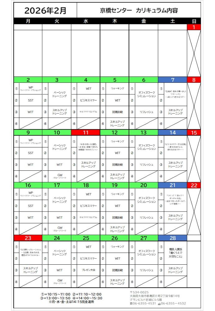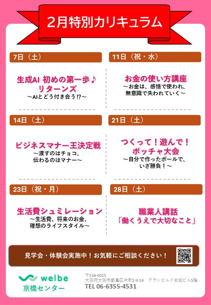 さて、京橋センターでは2月のカリキュラム表が完成いたしました!