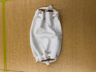 1つ目はTシャツを使ったマスクを作りました。袖の部分を使用するので、1枚のTシャツから2つ作ることが出来て耳にかけるゴムの部分も同じTシャツから作るため、必要な材料はTシャツのみ、道具もハサミがあれば作ることが出来ます。今回はこちらで用意した新品のものを使っていただきましたが、ご自宅で着なくなったTシャツでも十分に可能なので経済的でもあります。