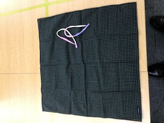 2つ目はハンカチを使ったマスクを作りました。こちらは一般的なハンカチ(40cm×40cm以上のもの)とヘアゴム2つを使用しハンカチを折りたたむだけなので、不要な時は再度ハンカチとして使うこともできます。今回はヘアゴムが用意できなかったので100均の布紐で代用して作りました。