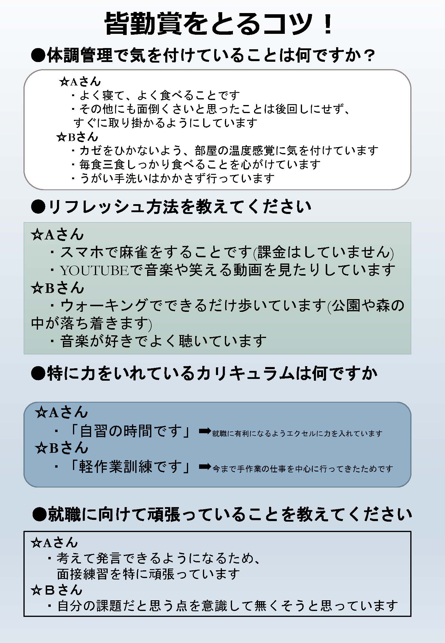今回は、3月に皆勤賞を取られた当センターの方々にアンケートを行いました。