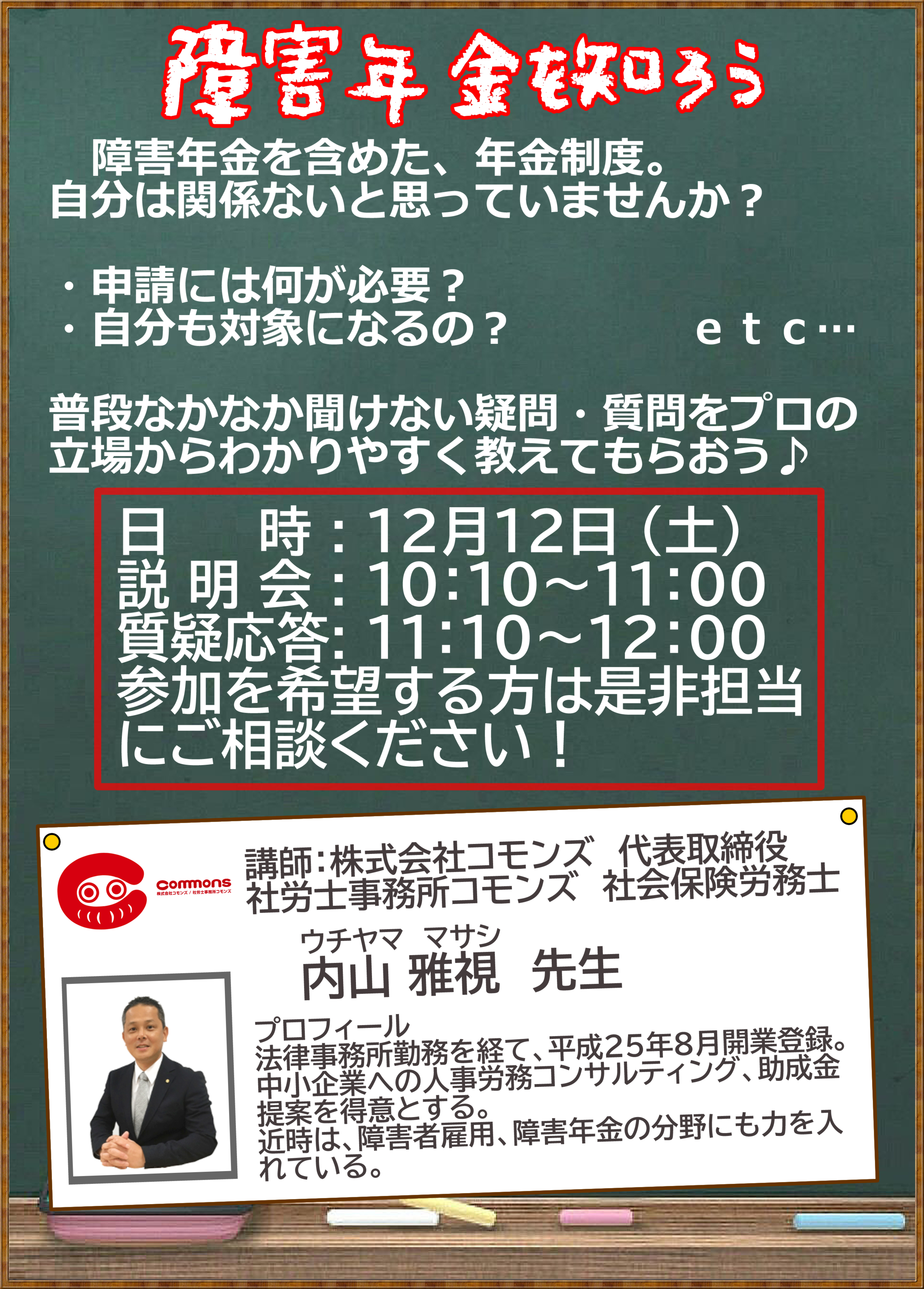 さて、ウェルビー新潟センターでは12/12(土)『社労士事務所 コモンズ』様にお越しいただき、障害年金講座・個別相談会を開催しました。
