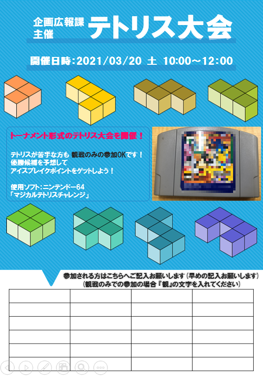 今回の特別プログラムでは、「今までにない特別プログラムをやろう」という目標のもと、午前に「テトリス大会」、午後に「映画鑑賞会」を実施致しました。