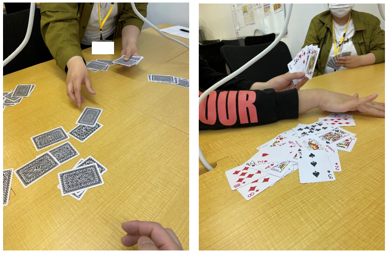 王道のゲーム「ババ抜き」から始まり、カードを丸く円のように並べて順番にカードをとって真ん中に置いていくゲーム「ぶたのしっぽ」、心理戦を楽しむゲーム「ダウト」などを行い白熱した大会となりました。