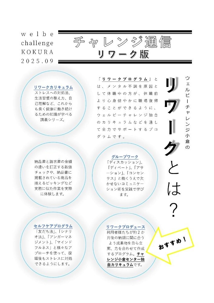 さて、毎月更新しております【チャレンジ通信リワーク版】ですが、