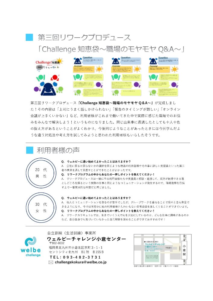ウェルビーチャレンジ小倉センターでは、リワーク支援を受けている利用者様が