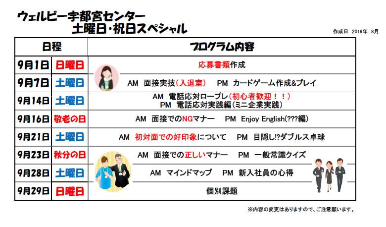 スペシャルイベントは、9月の下旬に開催される「2019 とちぎ障害者就職合同面接会」に向けて、個別対応での応募書類作成、面接実技練習、面接マナー講座等のさまざまなイベントをご用意しております。