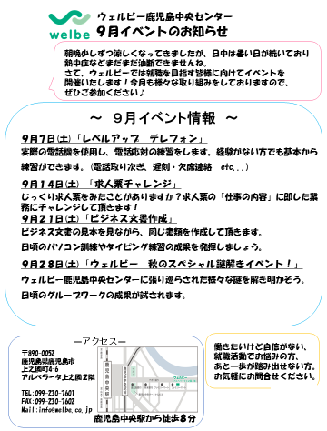 9月のイベント予定が決定しましたので、お知らせします☆