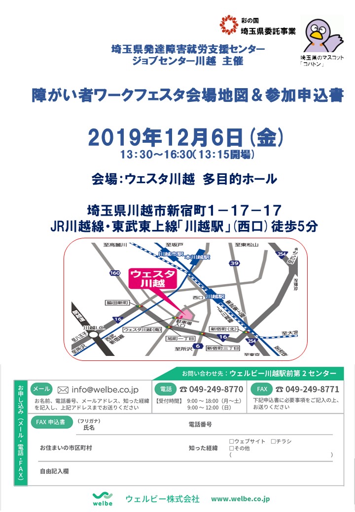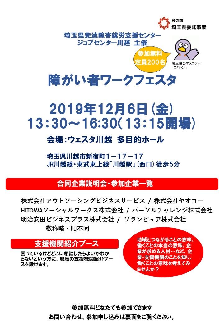【ジョブセンター川越】障害者ワークフェスタのお知らせ(12月6日)