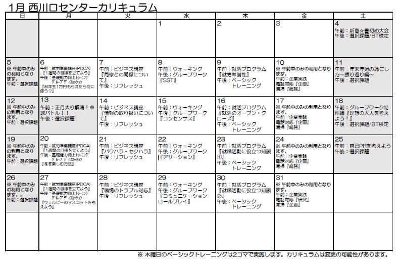 月曜から金曜まではPC訓練や軽作業、ビジネス講座、グループワークなど、
