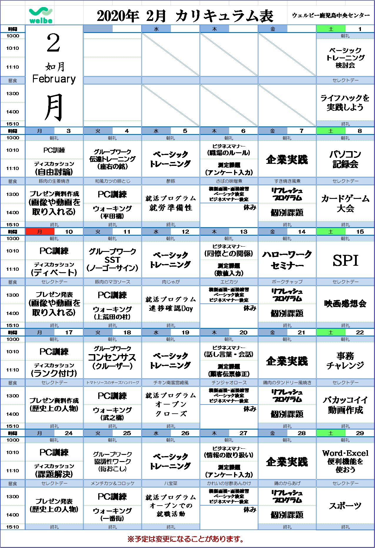 ウェルビー鹿児島中央センターでは、2020年から週間カリキュラムが変更になっております。