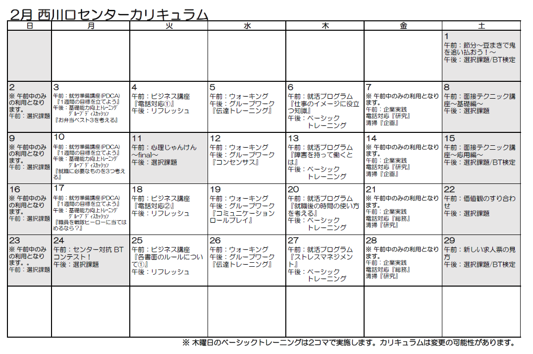 月曜から金曜まではPC訓練や軽作業、ビジネス講座、グループワークなど、