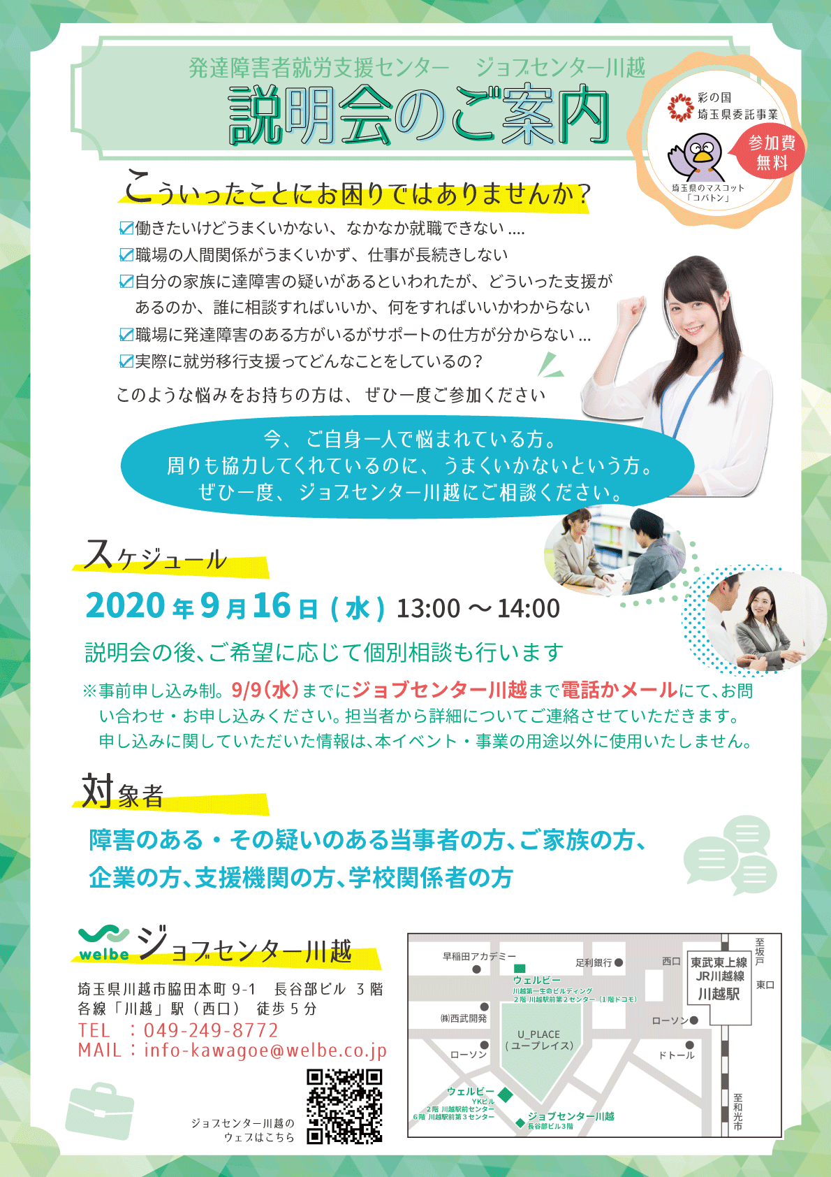 ※事前申し込み制。 9/9(水)までにジョブセンター川越まで電話かメールにて、お問い合わせ・お申し込みください。担当者から詳細についてご連絡させていただきます。