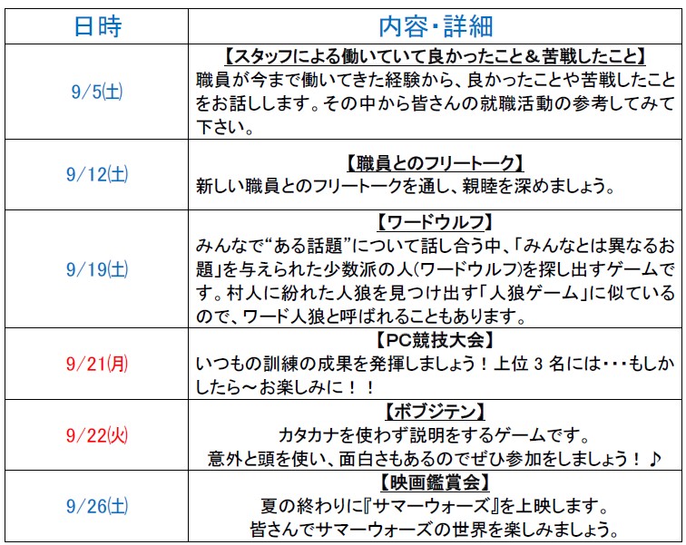 9月の土曜&祝日のオリジナルカリキュラム発表!!