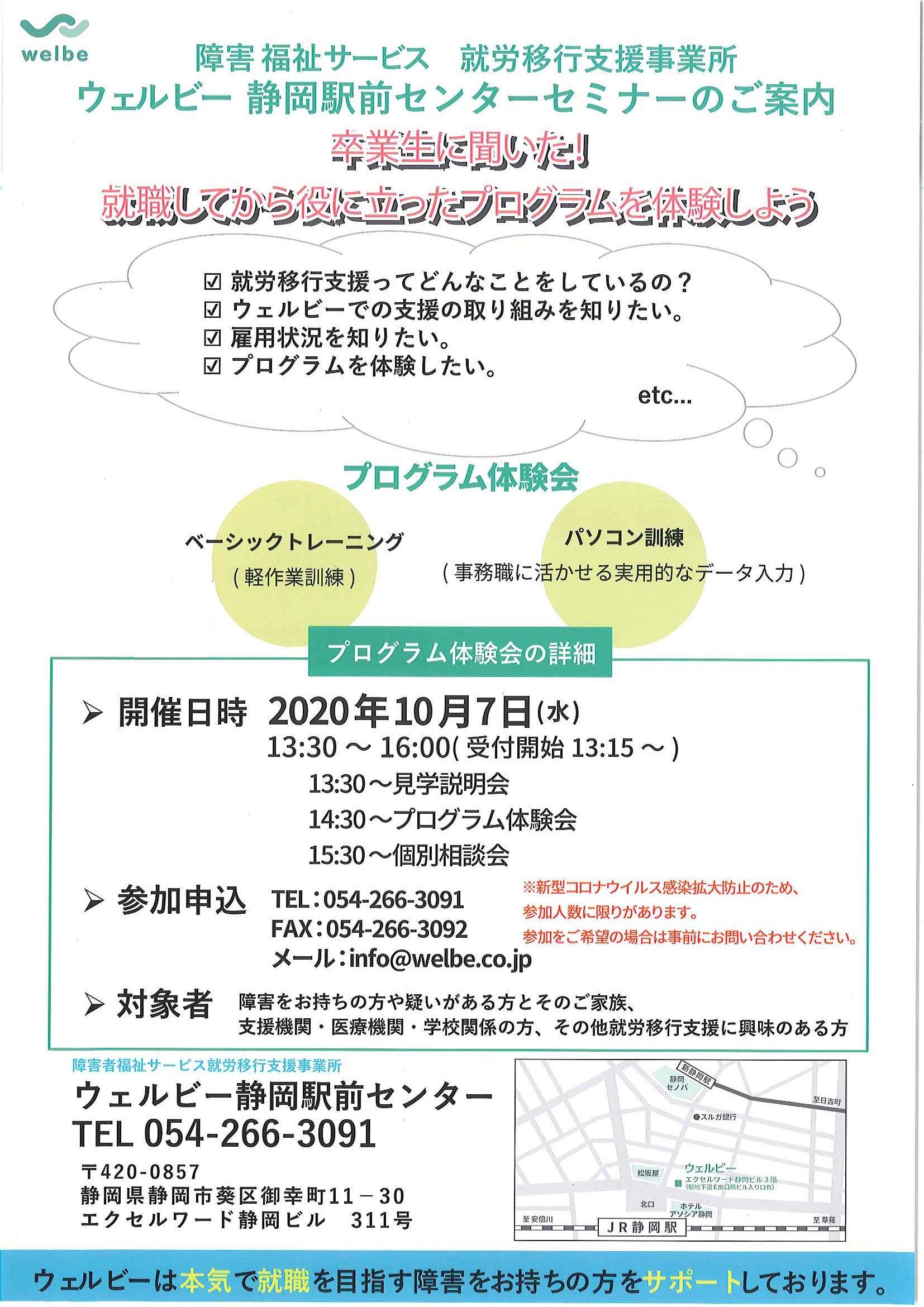 静岡駅前センターでは10月7日(水)にプログラム体験会を実施いたします。通常は個別に受け付けている見学に加えて、ウェルビーの事をより知っていただける内容をご用意しています。