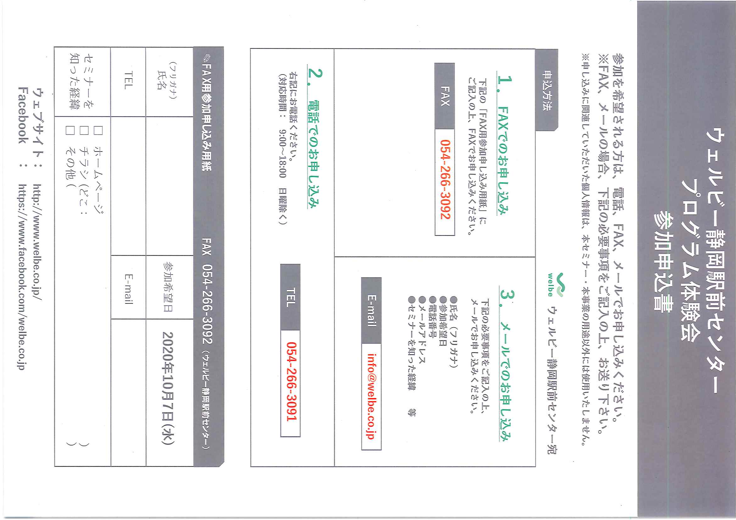 - FAX:054-266-3092 にイベントチラシ裏面にある「FAX用参加申し込み用紙」に記入の上、FAXをしてください。