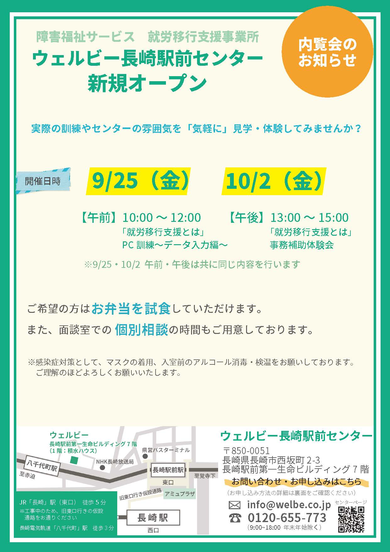 長崎駅前センターでは、昼食のお弁当が提供されます!さらに内覧会が、9月25日(金)と10月2日(金)に開催されますので、興味のある方は、お気軽にご参加ください!