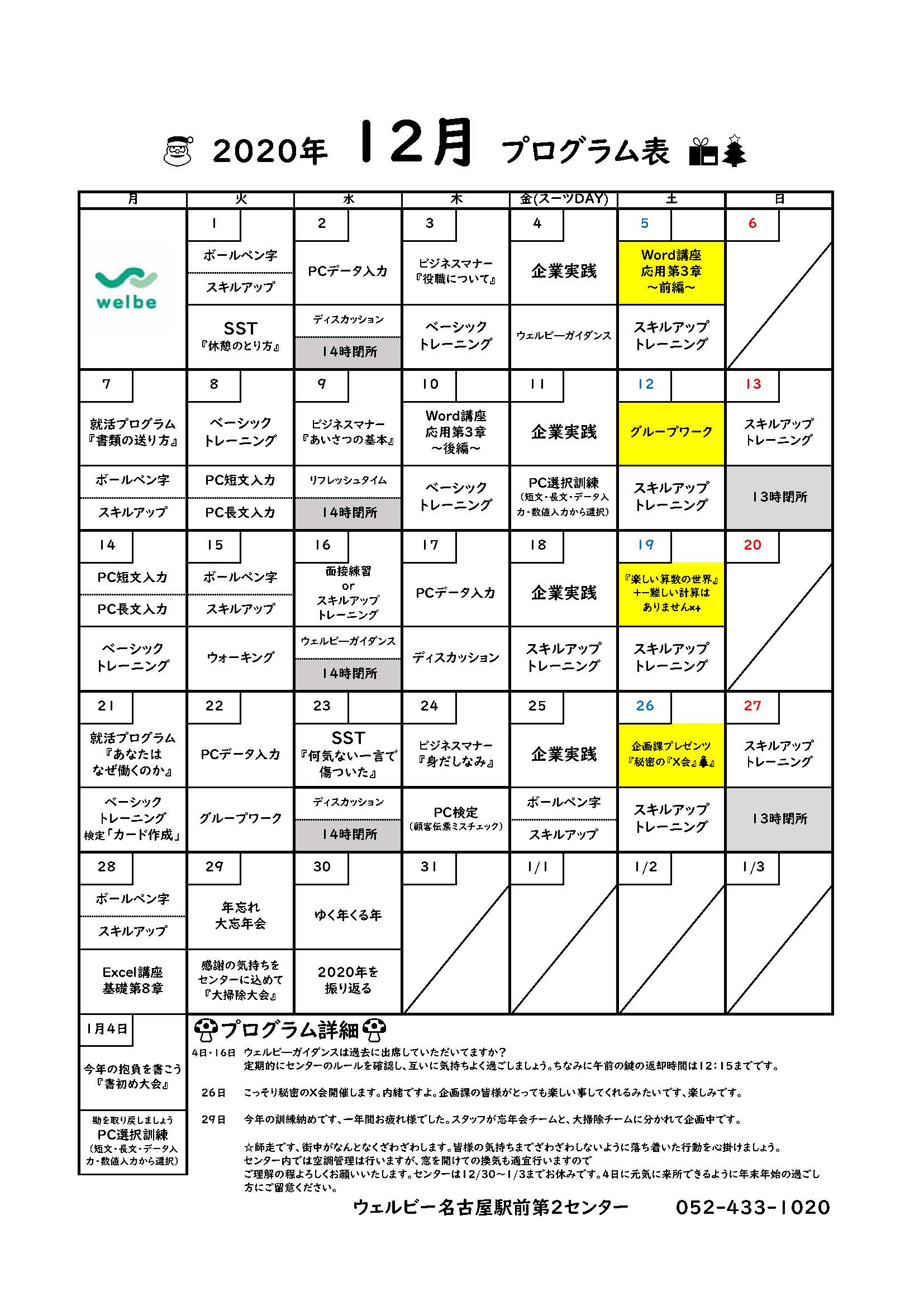 さて、名古屋駅前第2センターの12月プログラム表が完成しました。