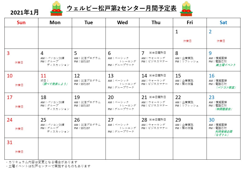 さて、今回はウェルビー松戸第2センターの1月の月間予定表をご紹介したいと思います。