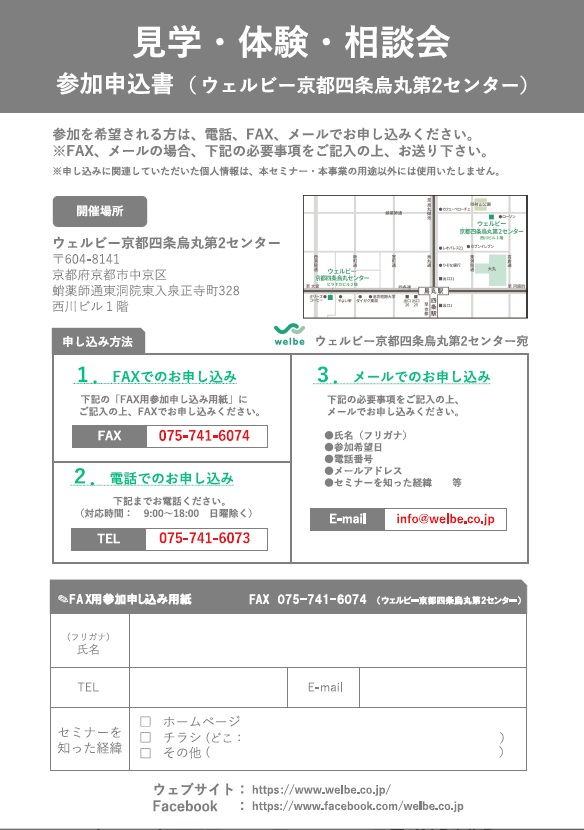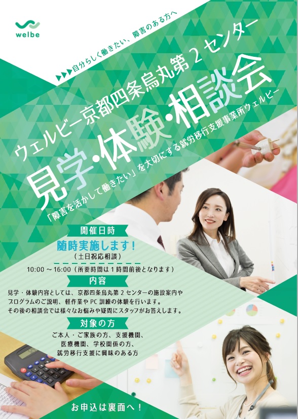 内容としてはウェルビー京都四条烏丸第2センターの施設案内やプログラム説明、軽作業やPC訓練の体験を行っていただけます。