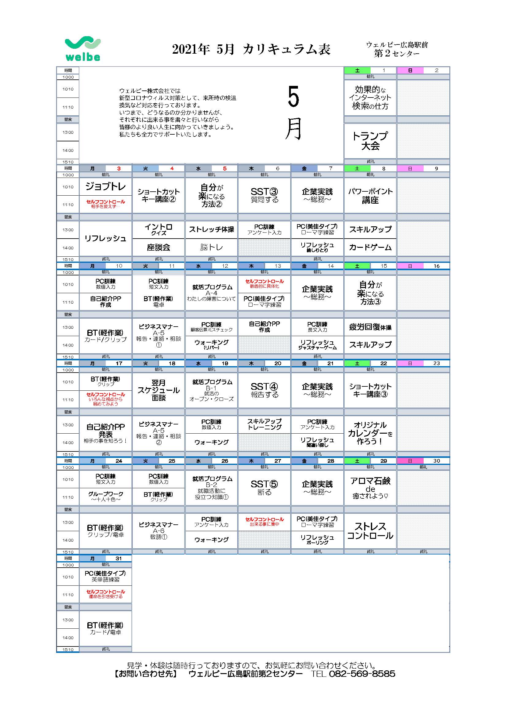 早速ですが5月のカリキュラム表をアップさせて頂きます。