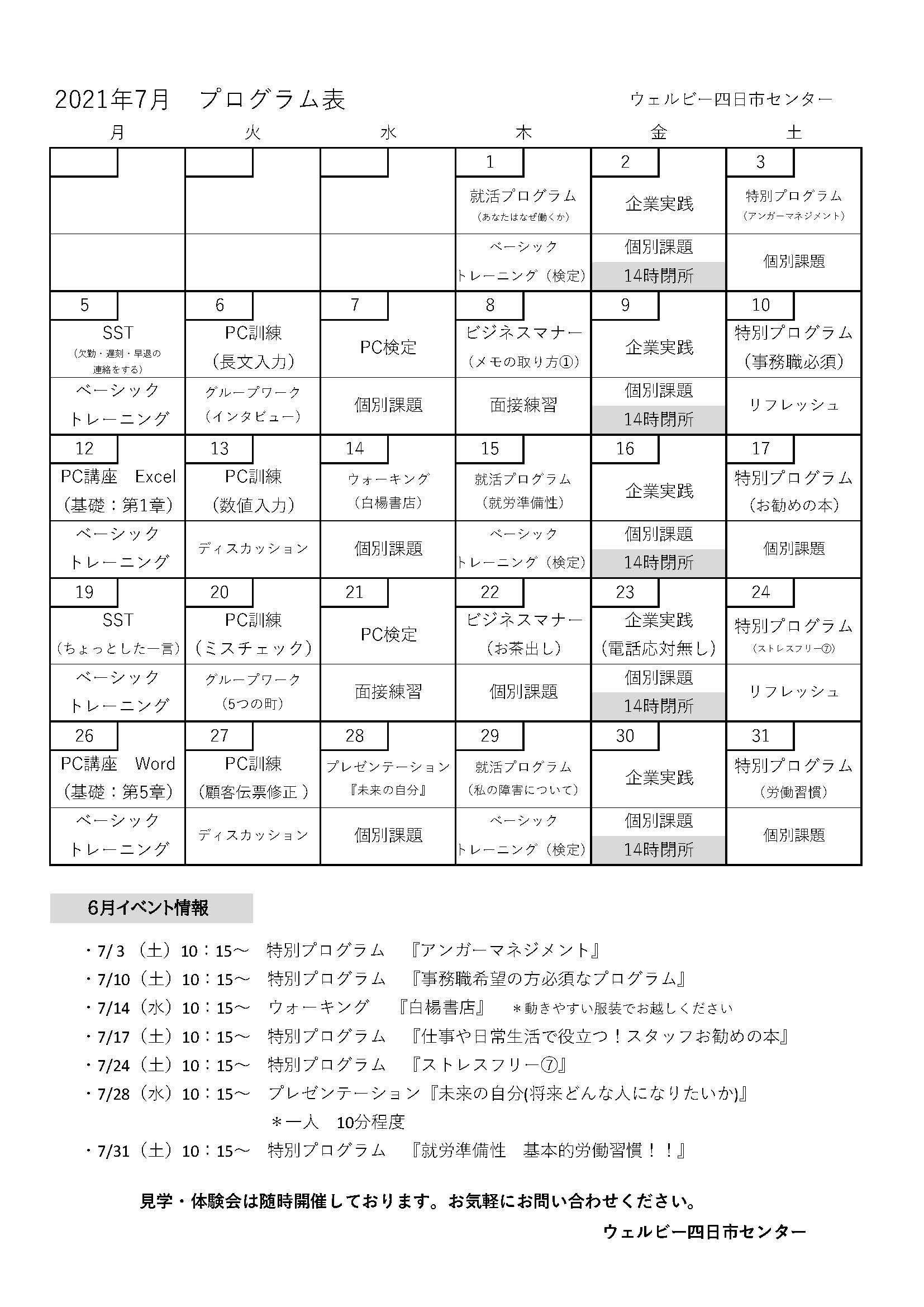 ウェルビー四日市センターでは7月も魅力的なプログラムをたくさん用意しております。