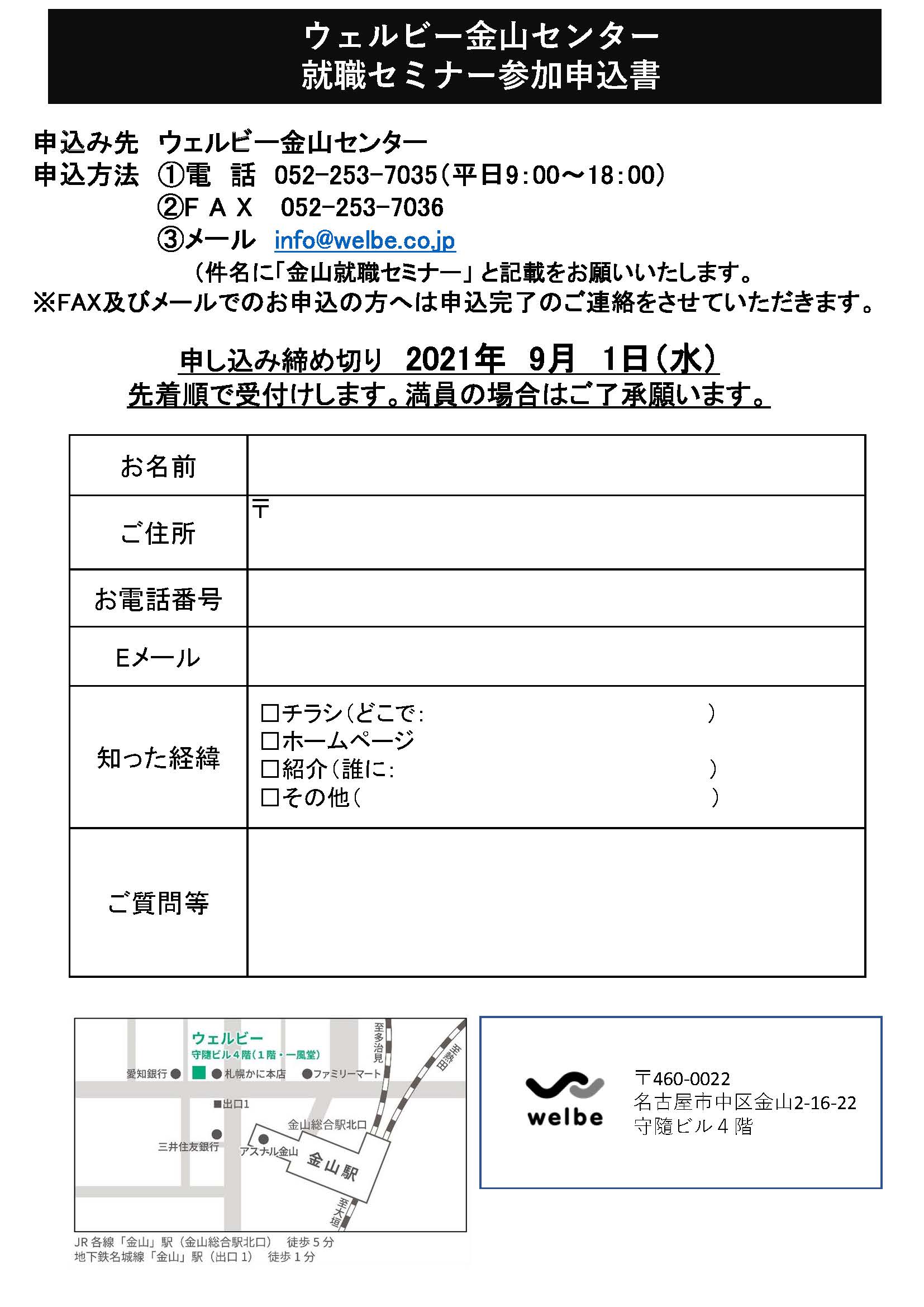 ・メール info@welbe.co.jp(件名に『金山就職セミナー』と記載お願い致します)