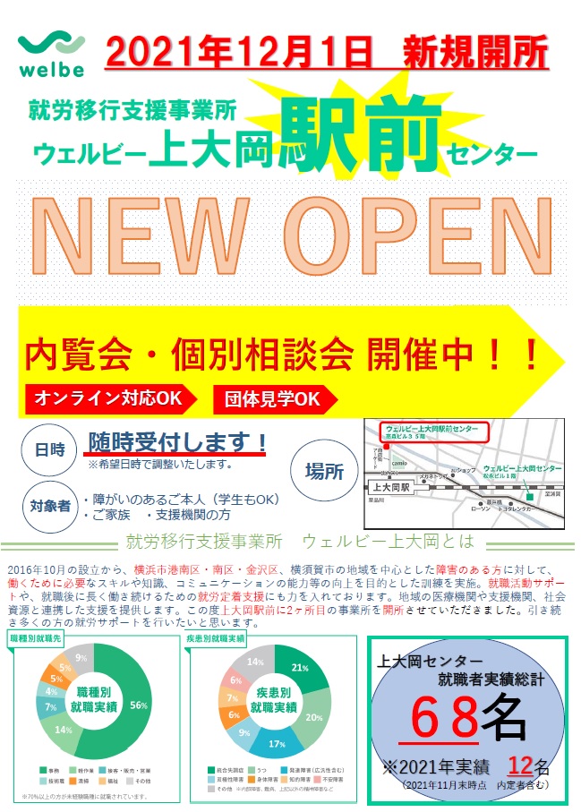 ウェルビー上大岡駅前センターでは、新型コロナウイルス感染予防のため、検温・マスク着用・手洗い消毒の徹底、飛沫防止パーテーションの設置、センター内のアルコール消毒、常時換気を実施しております。安心して訓練に臨める環境をご準備しております。