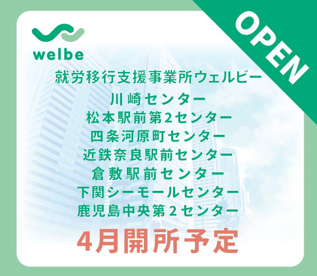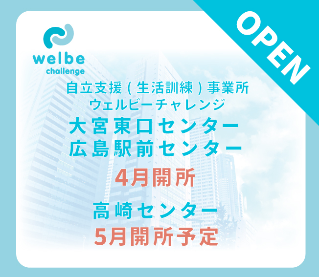 新着情報 トピックス 就労移行支援事業所ウェルビーで4月に7センター開所 Read more. 自立訓練(生活訓練)事業所ウェルビーチャレンジで4月に2センター開所、5月に1センター開所予定 Read more. 自立訓練(生活訓練)事業所ウェルビーチャレンジで4月に2センター開所予定 Read more. 就労移行支援事業所ウェルビーで4月に7センター開所予定 Read more. 2023年1月13日(金)に弊社Webサイトより「資料請求」・「見学予約」・「お問い合わせ」をいただいたお客様へ Read more. 第1回関西就労フォーラム 『障害者雇用促進につながる地域ネットワークの強化』 Read more. « 前へ 1 … 9 10 11 12 13 … 19 次へ»