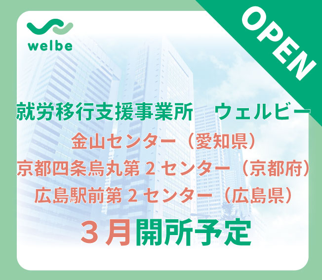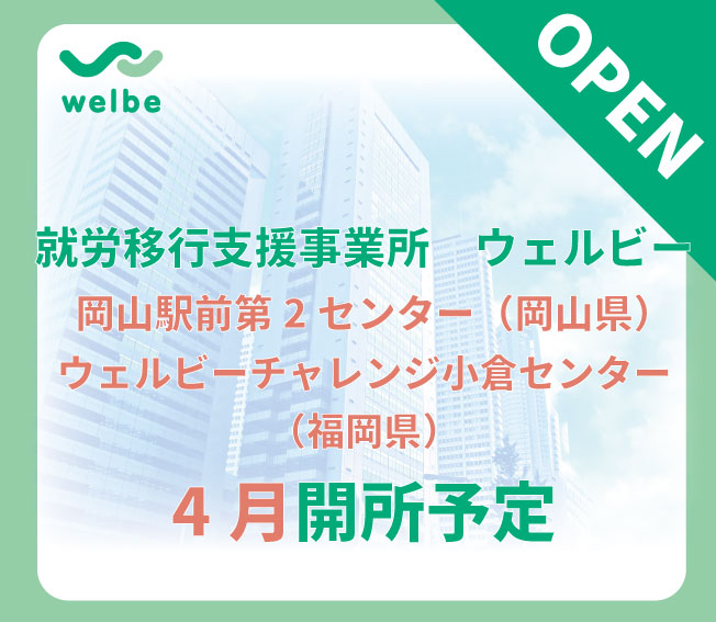 新着情報 トピックス 【5月22日】オンラインイベント開催のお知らせ Read more. 就労移行支援事業「ウェルビー梅田センター」を5月開設 Read more. まん延防止重点措置適用対象エリアの皆さまへ(4月13日時点) Read more. 【5月14日開催】ウェルビー就労フォーラム2021(高崎・宇都宮)のお知らせ Read more. 就労移行支援事業「ウェルビー岡山駅前第2センター」「ウェルビーチャレンジ小倉センター」を4月開設予定 Read more. 就労移行支援事業ウェルビー「金山センター」「京都四条烏丸第2センター」「広島駅前第2センター」を3月開設予定 Read more. « 前へ 1 … 14 15 16 17 18 19 次へ»
